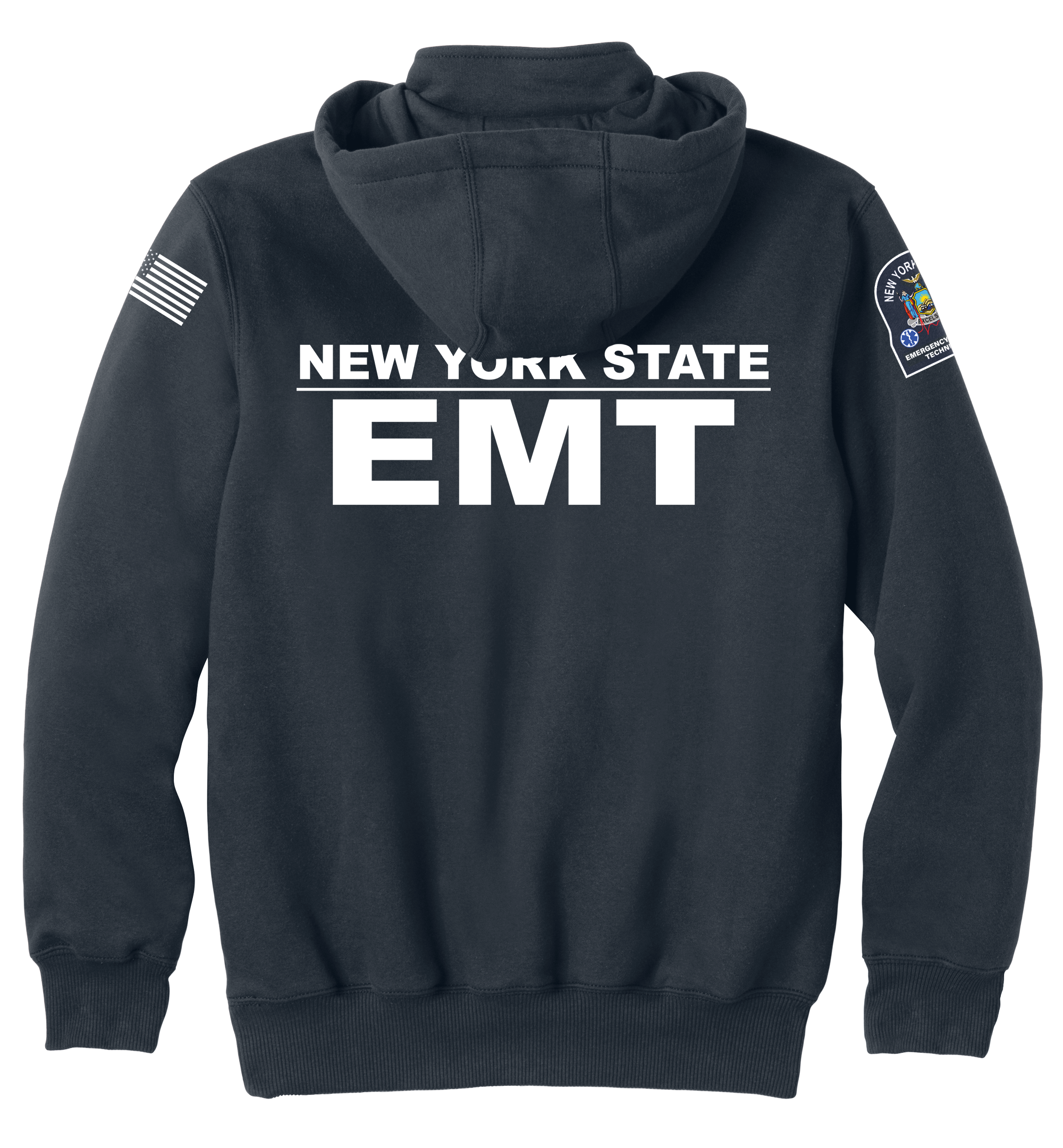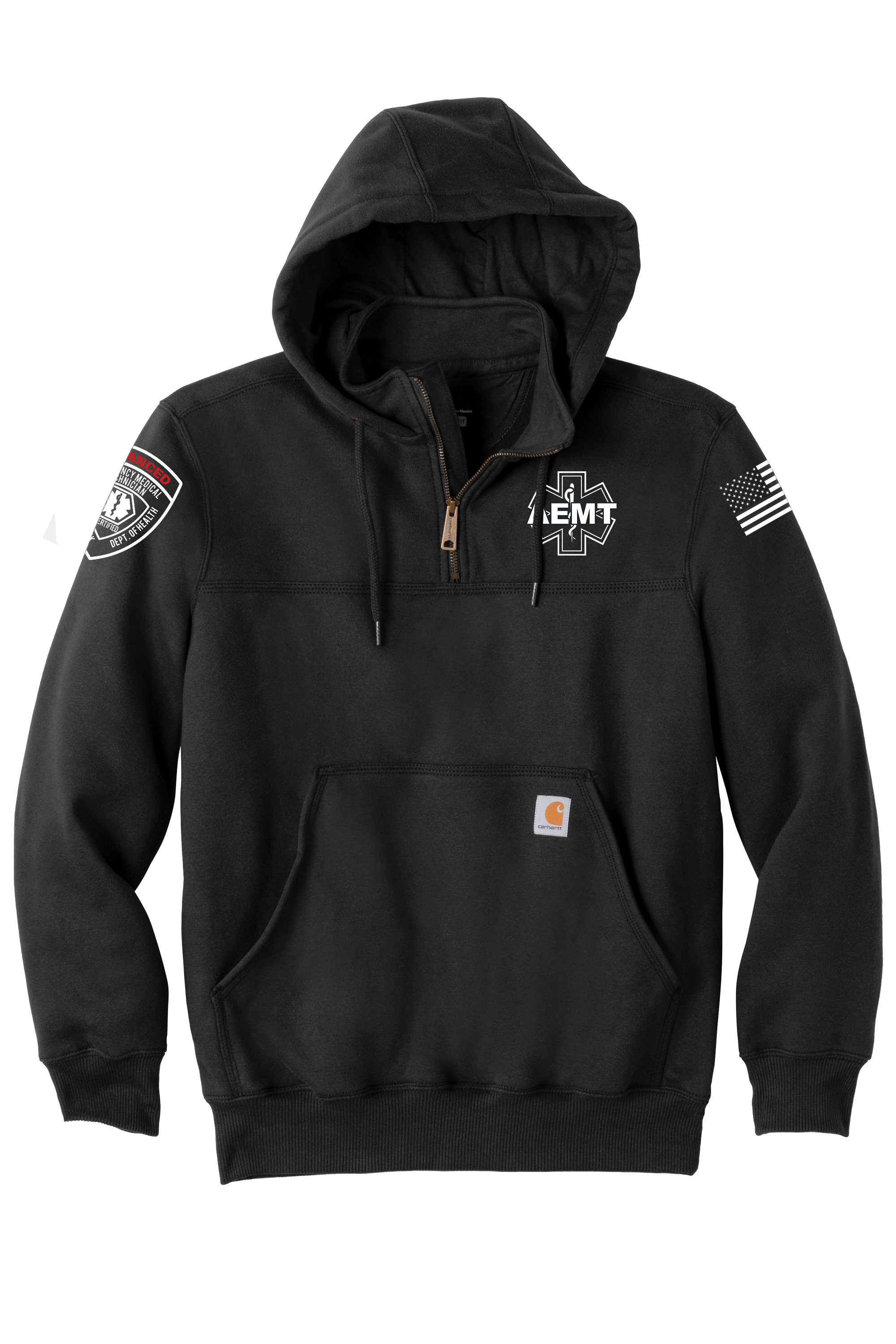 Our New York EMS Carhartt® Rain Defender® 1/4 zip sweatshirts are printed on their durable water-repellant material and are a loose fit that offers room for layers underneath. These heavy 13-ounce hoodies are perfect for enduring our cold NY fall and long lasting winters!